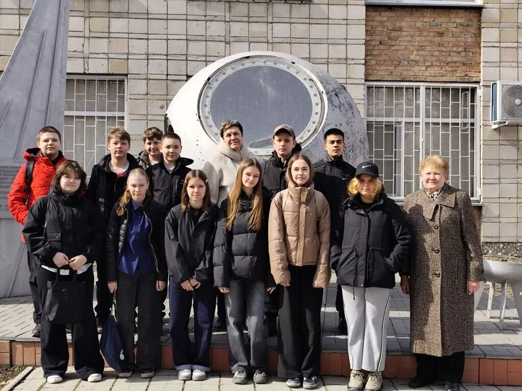 И в завершении мероприятия сделана памятная фотография у космической экспозиции, открытой около стен музея в 2012 году и посвященной летчикам-космонавтам, учившимся летать в Коченевском небе.