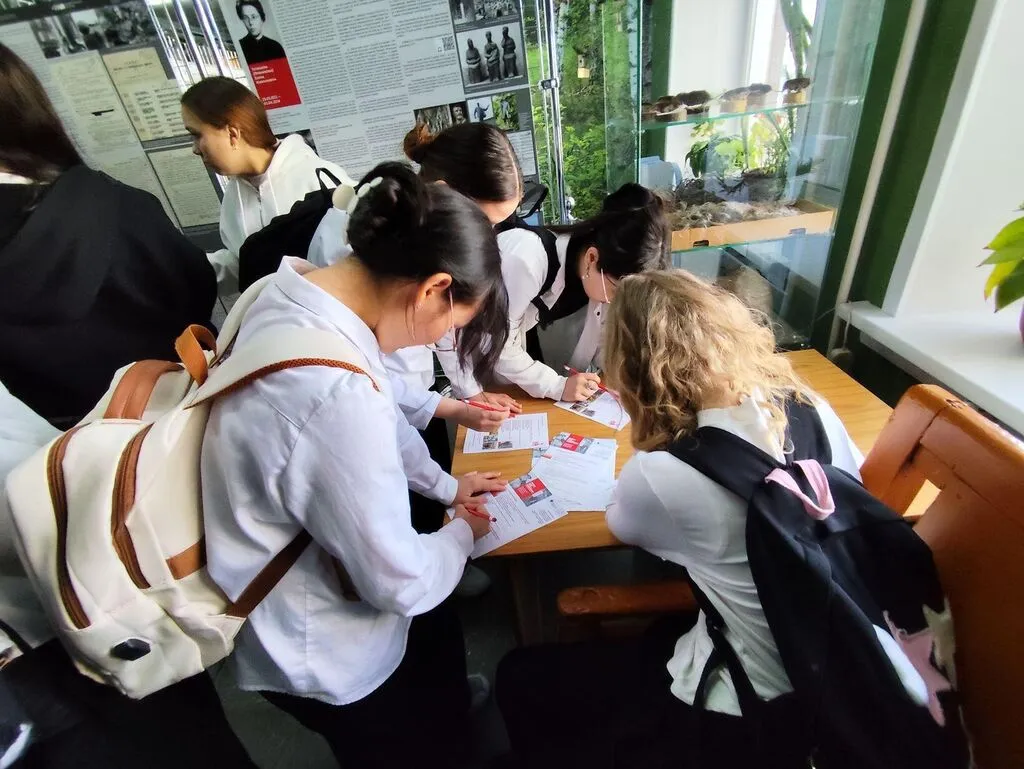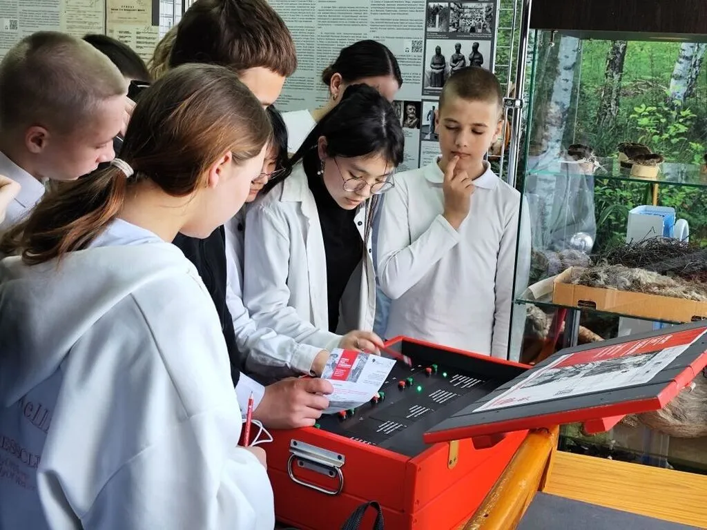 Информационные стенды содержат кьюаркоды на подробные аудиогиды, которые ребята смогли прослушать с помощью своих телефонов. Большой интерес вызвал у школьников интерактивный ящик, оформленный в стиле патронного, с помощью которого они отвечали на вопросы о выставке.